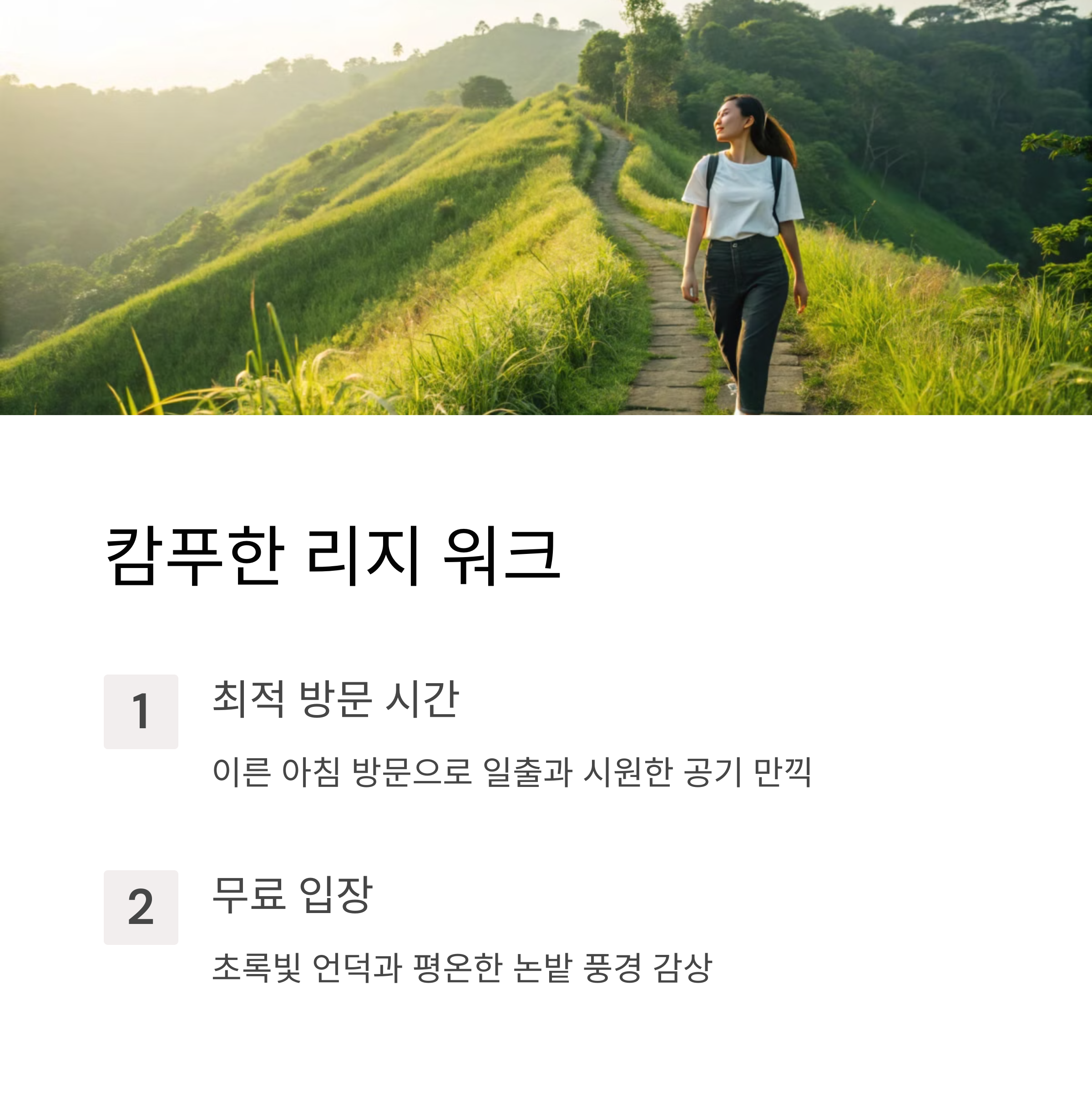 여기는 아침 일찍 방문하는 게 가장 좋아요. 이른 아침이면 시원한 공기와 함께 해가 떠오르는 장관을 감상할 수 있거든요. 입장료도 무료라 부담 없이 즐길 수 있다는 점도 매력적이죠.