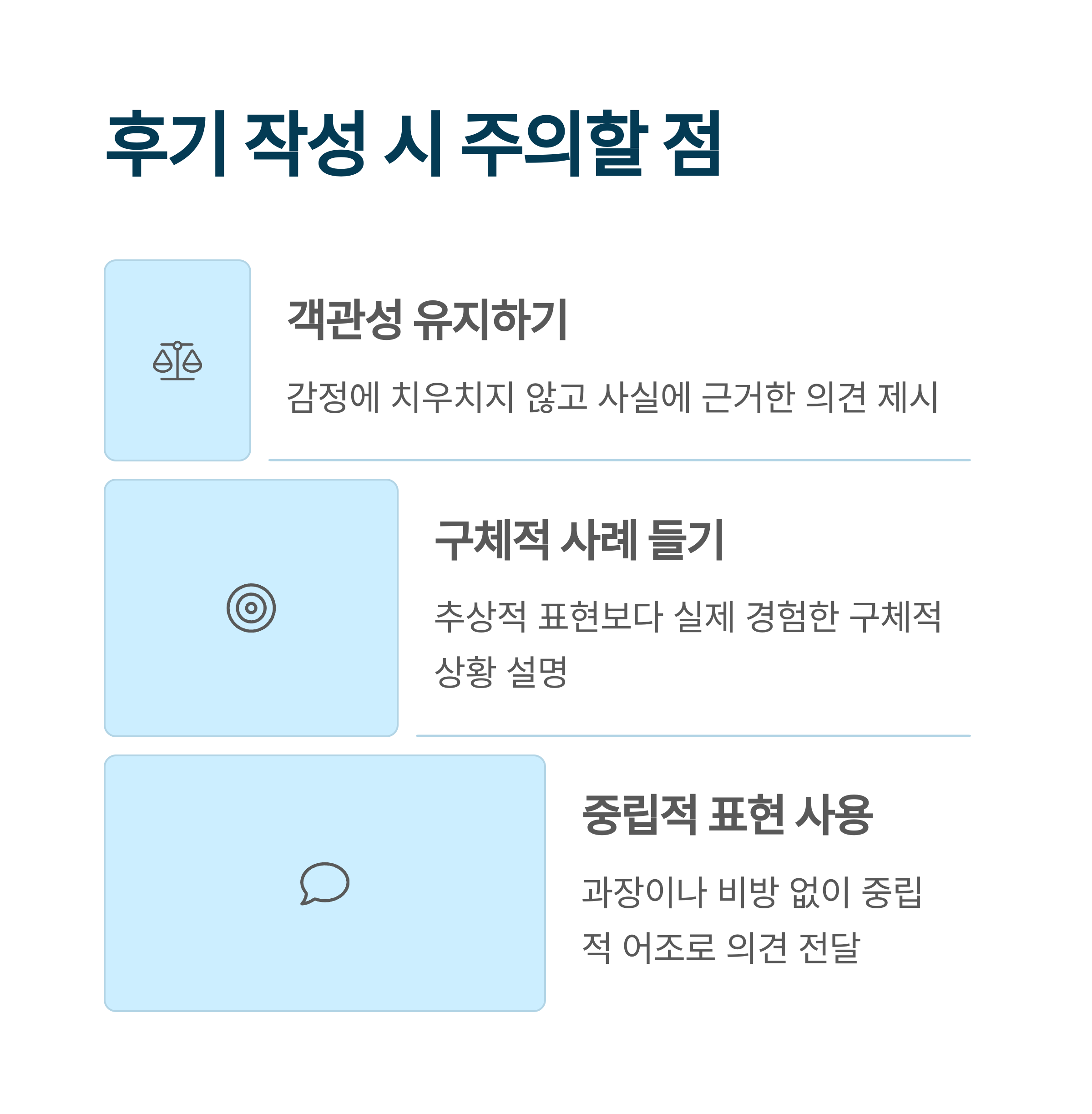 - 셋째, "나에게는 이랬다"는 식으로 개인적인 경험임을 명확히 표현합니다.