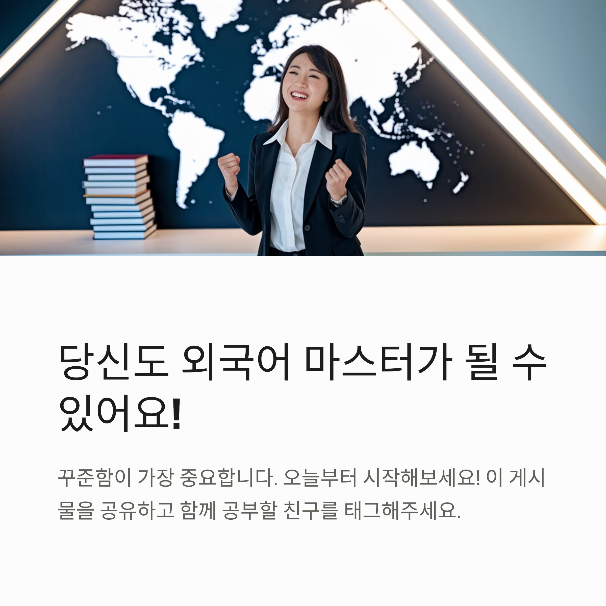 외국어 공부는 단거리 달리기가 아니라, 꾸준히 나아가는 마라톤입니다. 중간에 지칠 때도 있고, 실력이 느는 것 같지 않을 때도 있을 거예요. 하지만 포기하지 않고 계속한다면 분명 성장한 자신을 발견할 수 있습니다. 지금 당장 단어 하나라도 외우고, 한 문장이라도 따라 읽어보세요! 작은 습관이 쌓이면 큰 변화를 만들어냅니다.