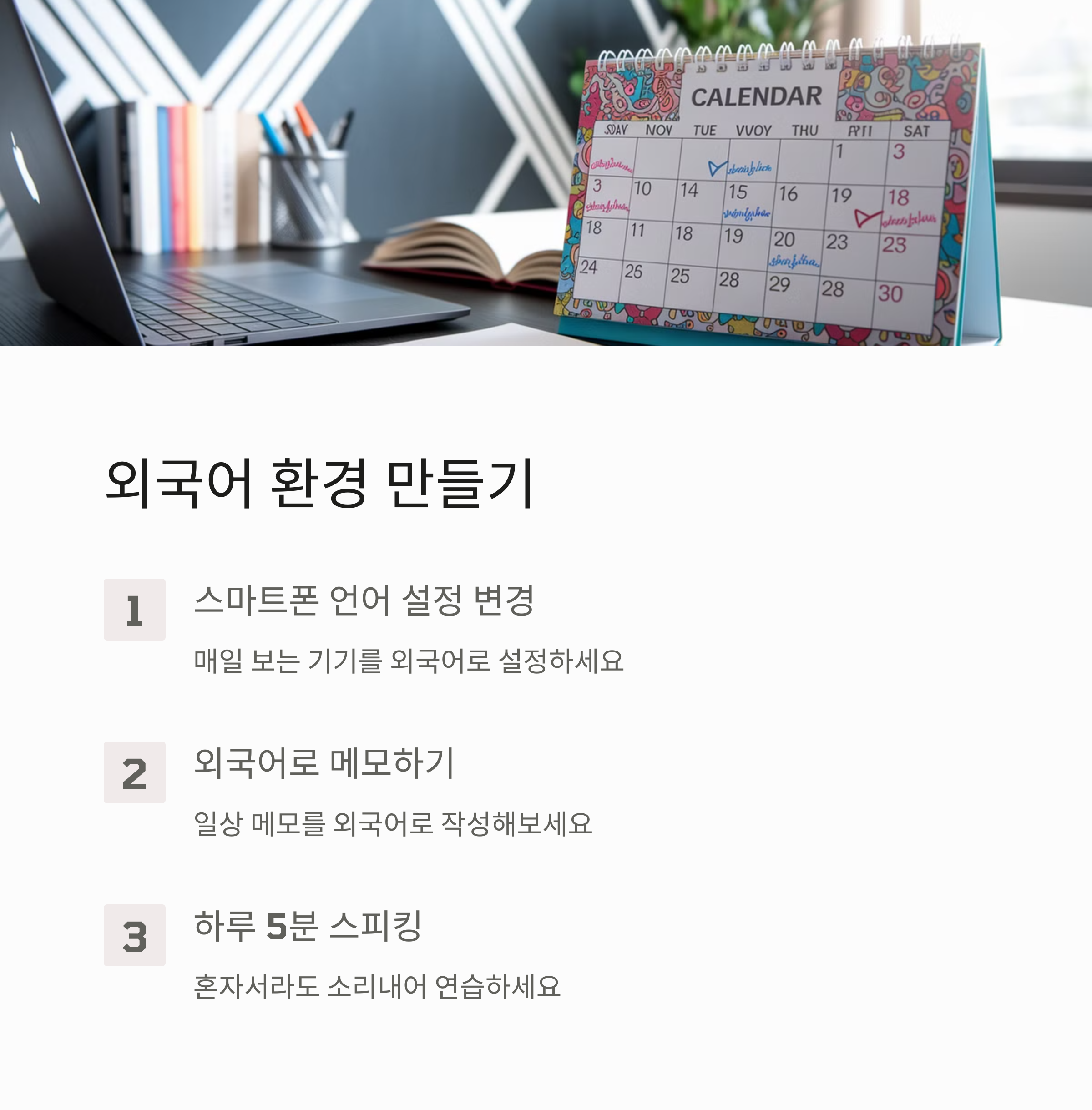 - 5. 하루 5분 스피킹 연습 - 혼자서라도 꾸준히 소리 내어 연습하세요.