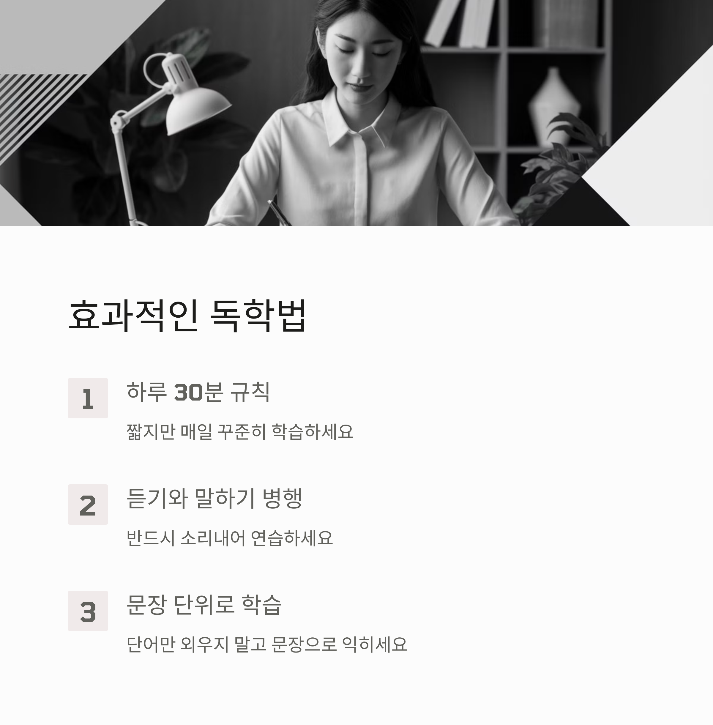 - 1. 하루 30분 규칙 - 짧지만 매일 꾸준히 학습하는 것이 중요합니다.