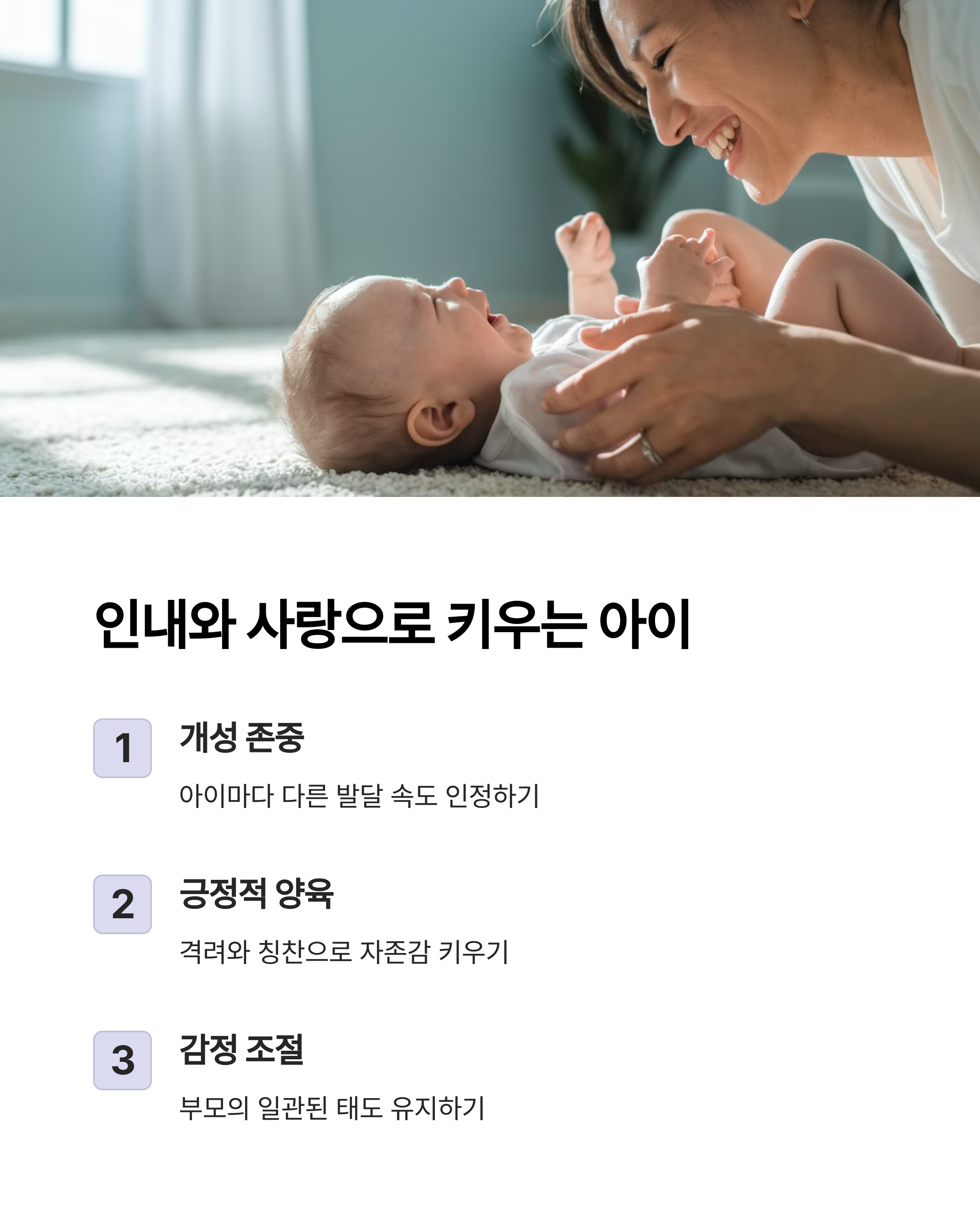 아기를 키우면서 "나는 좋은 부모일까?"라는 생각, 많이 하시죠? 하지만 육아에는 정답이 없습니다. 완벽한 부모가 되는 것보다, 사랑을 듬뿍 주는 게 더 중요해요.