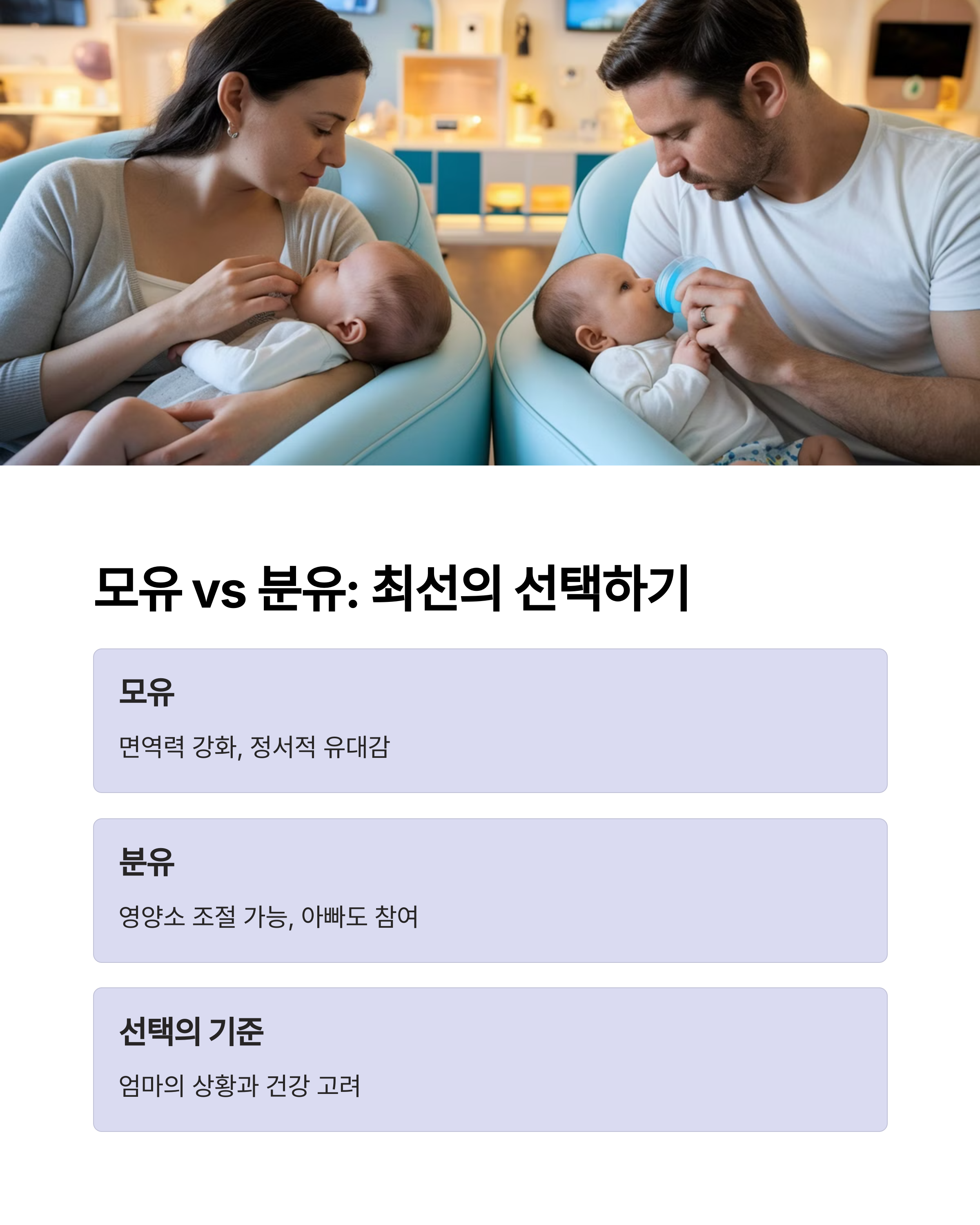 어떤 선택을 하든, 죄책감을 가질 필요는 없습니다. 모유가 힘들다면 분유도 훌륭한 선택이 될 수 있어요. 아래 표를 참고해, 본인과 아기에게 맞는 방법을 선택하세요.