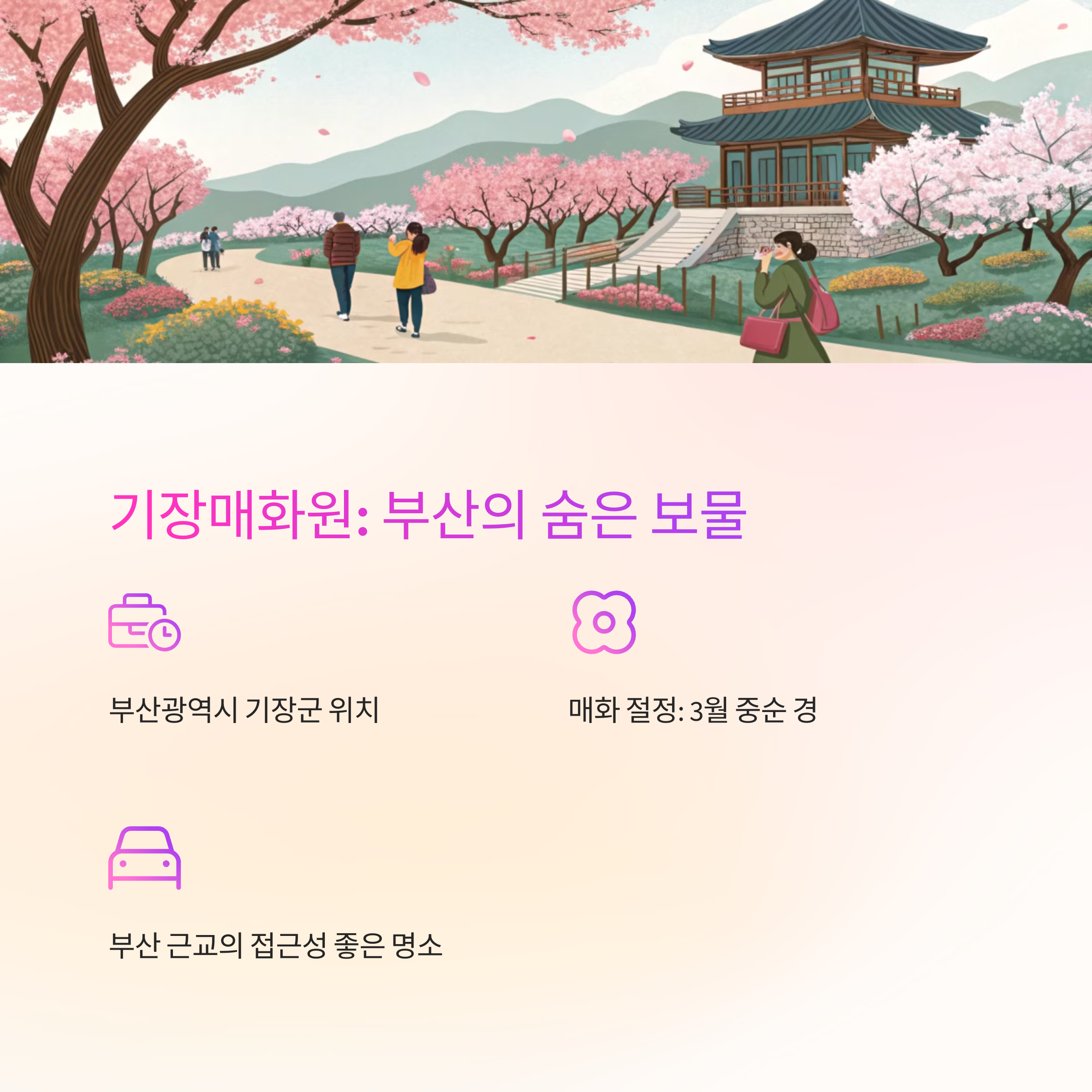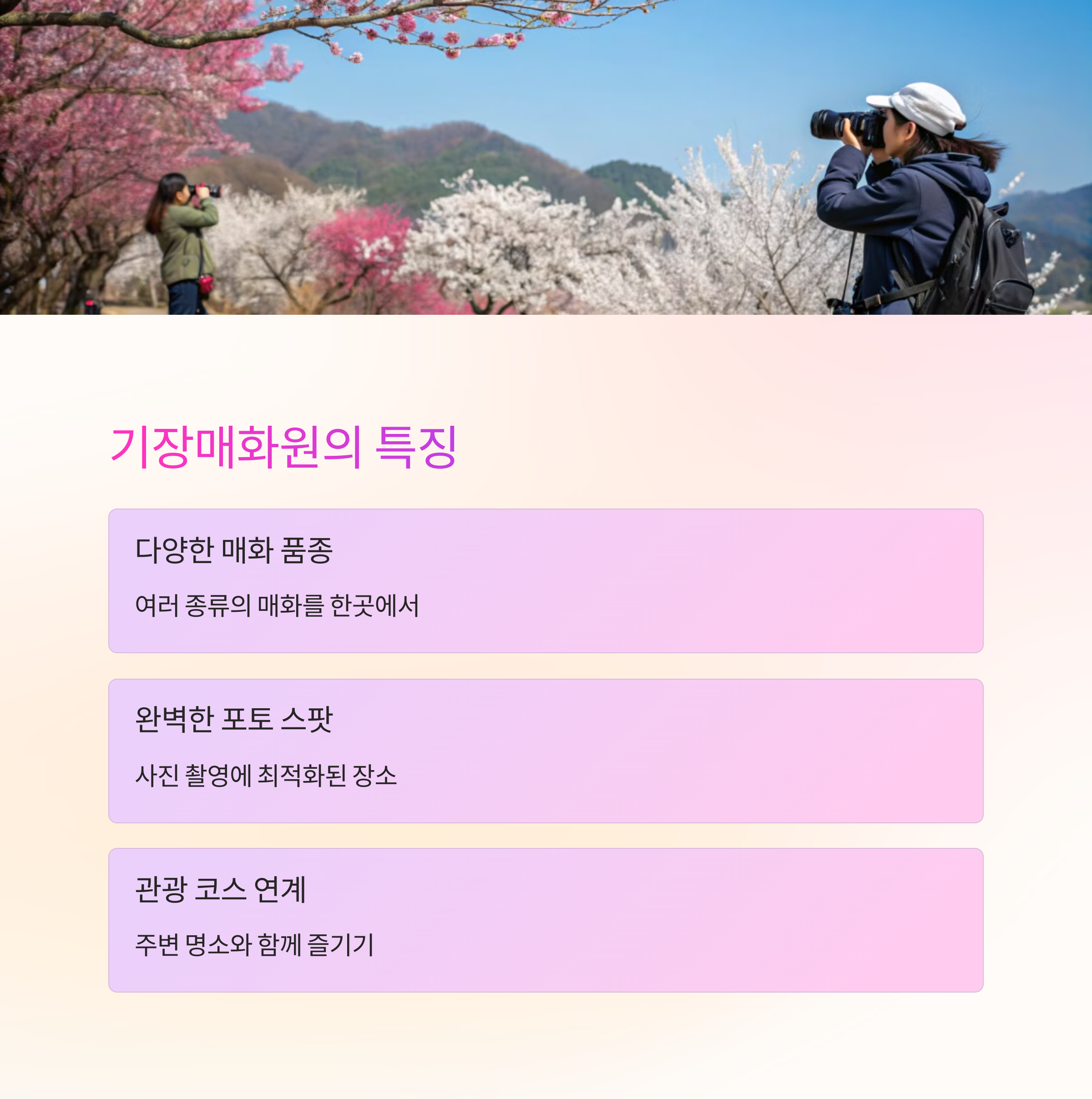 | 비교 항목 | 광양 매화마을 | 기장매화원 |