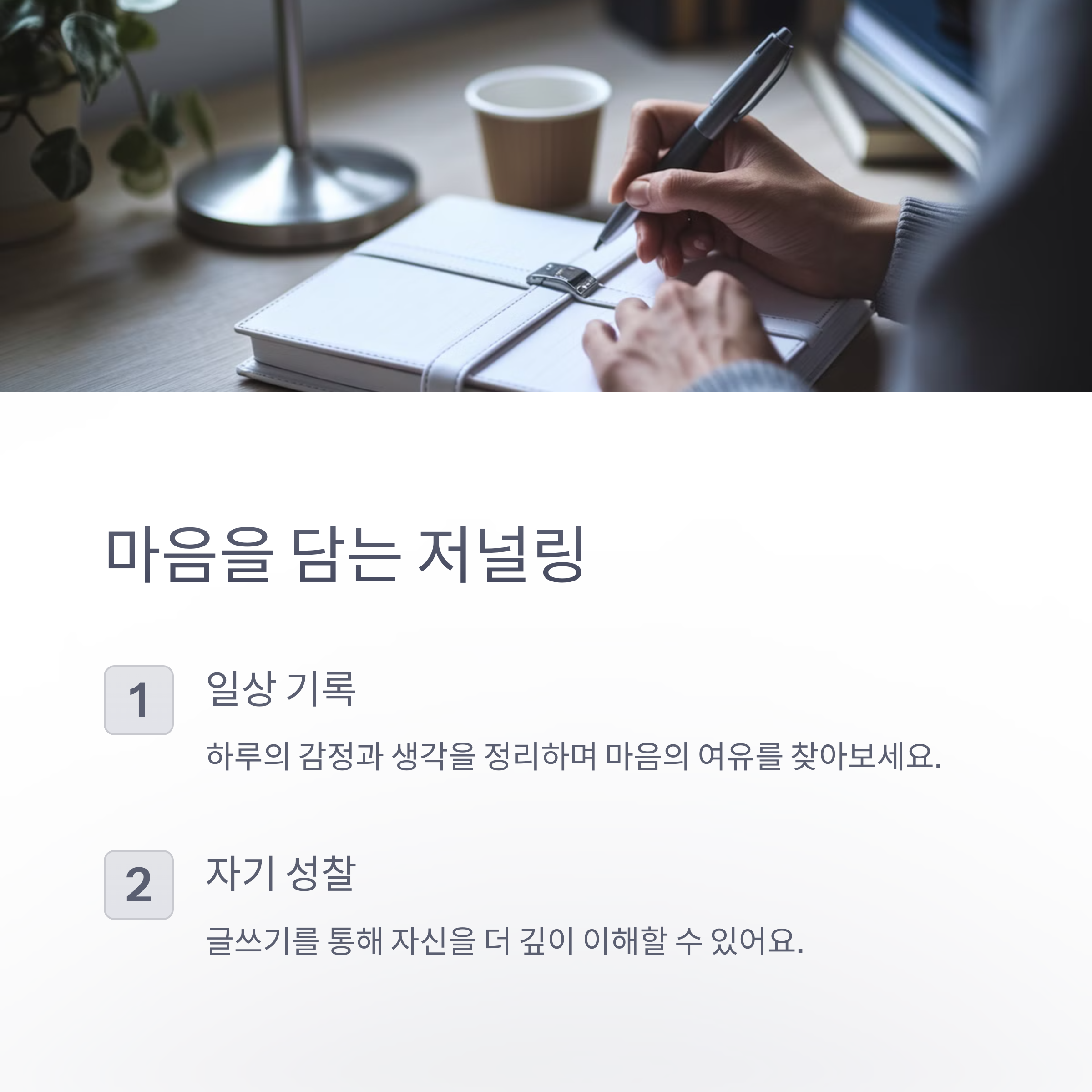 저널링(Journaling)은 단순한 일기 쓰기를 넘어, 나만의 생각과 감정을 정리하는 좋은 습관이에요. 일상의 소소한 기록부터 목표 설정, 감사일기까지 다양한 방식으로 활용할 수 있어요.