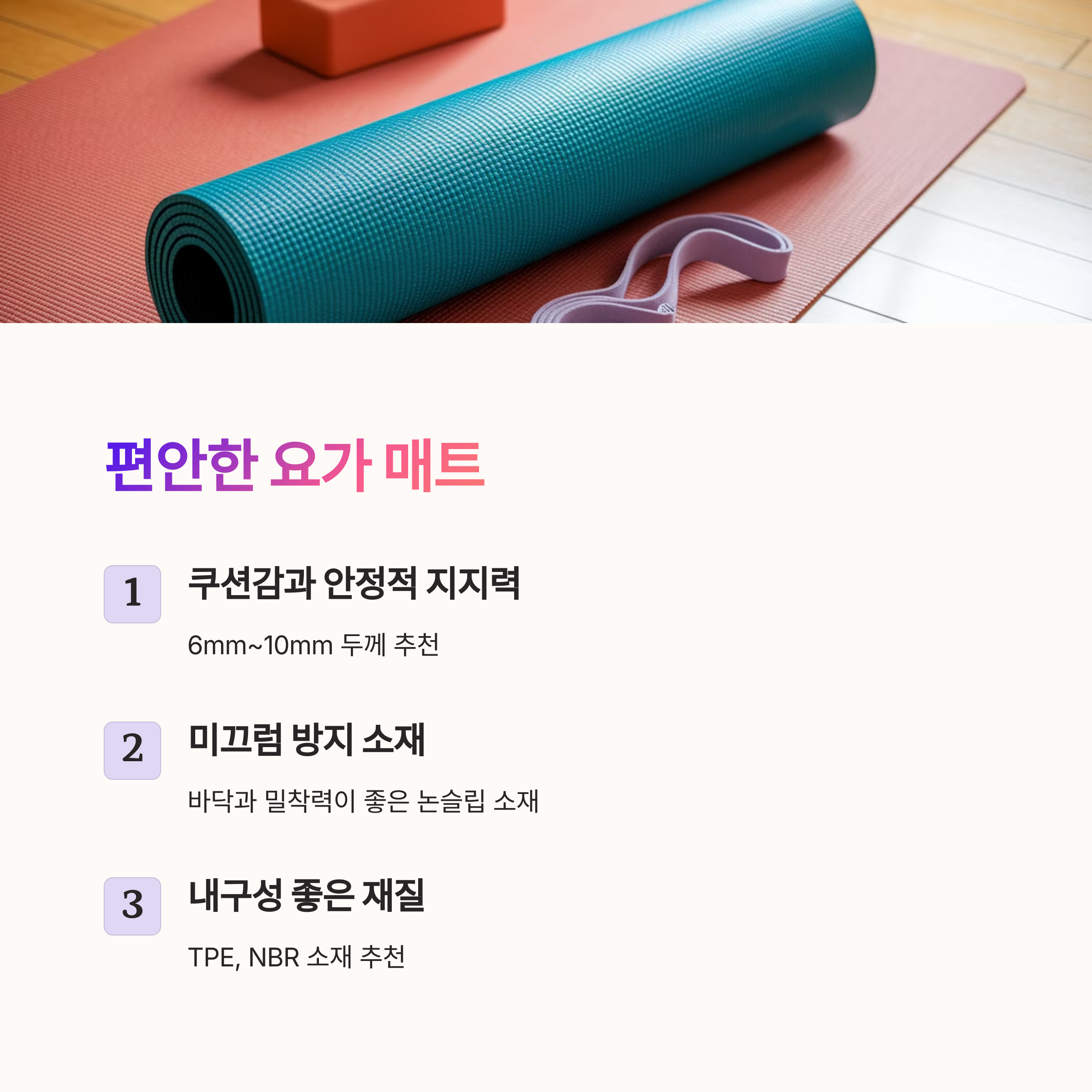 ✔ 요가 매트를 고를 때 고려해야 할 요소: