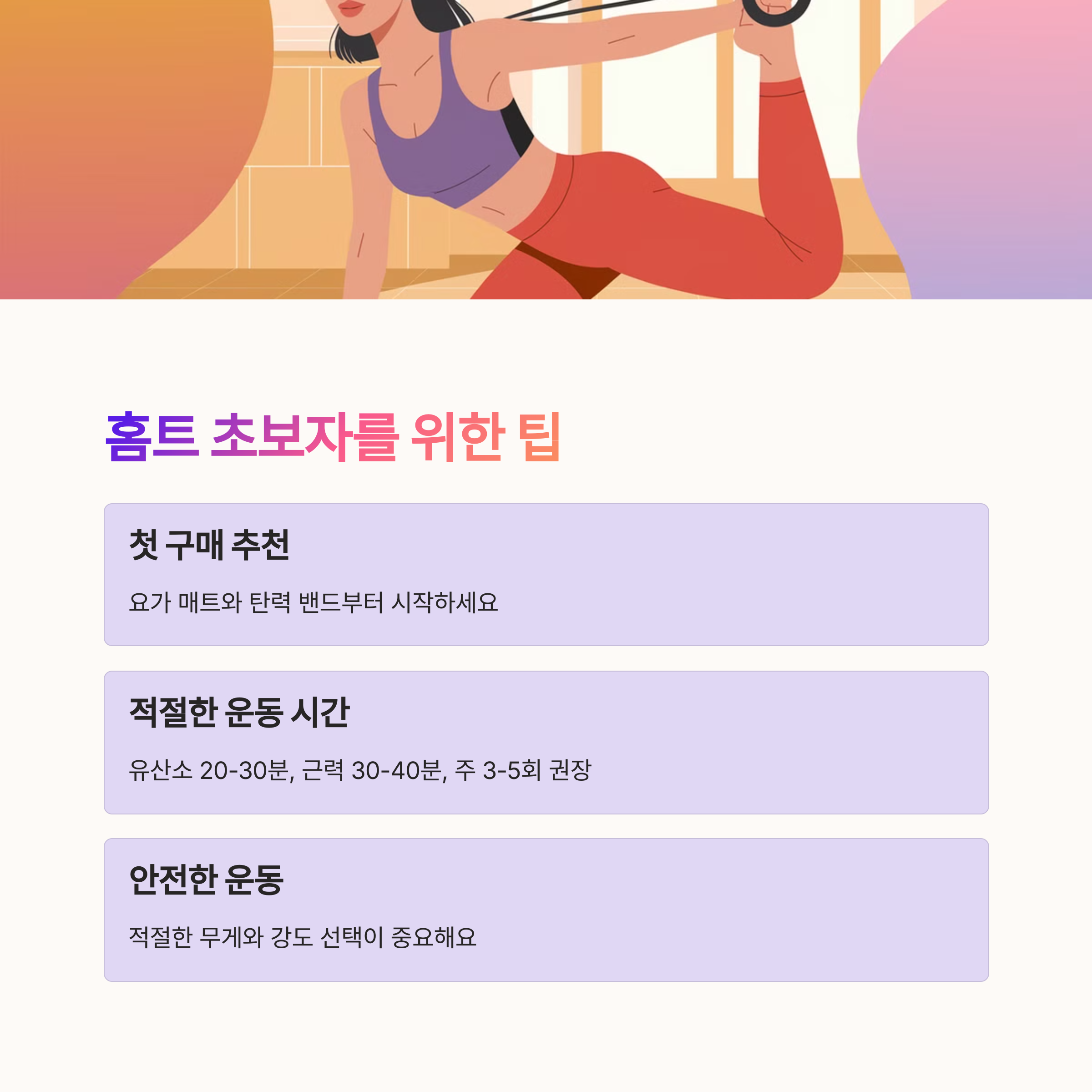 홈트 초보자라면 가장 먼저 요가 매트와 탄력 밴드를 추천합니다. 요가 매트는 다양한 운동을 편하게 할 수 있도록 도와주며, 탄력 밴드는 간단한 근력 운동을 시작하는 데 유용합니다.